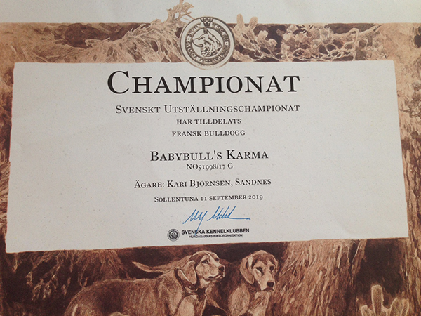 Exc-1, CQ, chcl, BOB, CACIB & Crufts qualification, among the 6 best in group 9 - NO JV-18, NO, SE, DK & NORD CH Babybulls Karma |