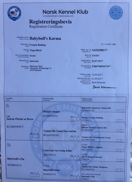 Far: F, ARG, Int Ch & Vice du Monde Eiffel du Senechal de Re Mor: N Ch Babybulls Emerald Eier: Kari Bjørnsen, kennel Babybull |