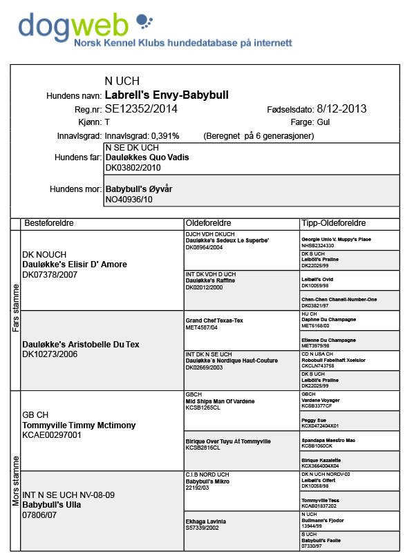 Far: N & S Ch Babybulls Fongo Mor: N Ch Joy of A Ray Ban Eier: Birger Moe |